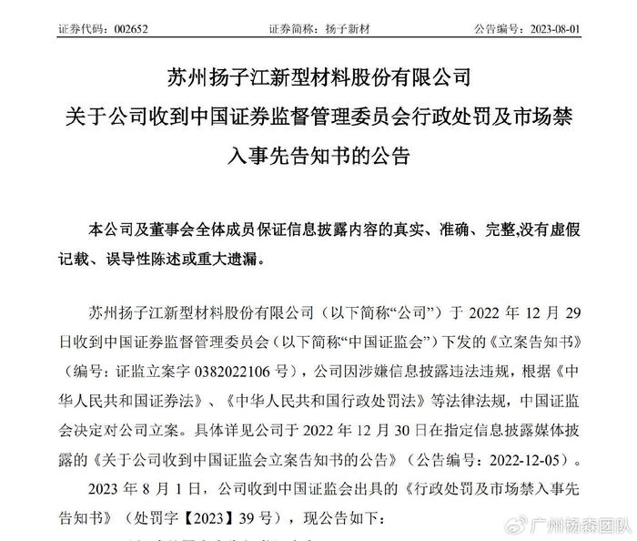 2023年8月2日,苏州扬子江新型材料股份有限公司(简称公司或者扬子新材)公告称,收到中国证监会出具的《行政处罚及市场禁入事先告知书》(处罚字【2023】39号)。