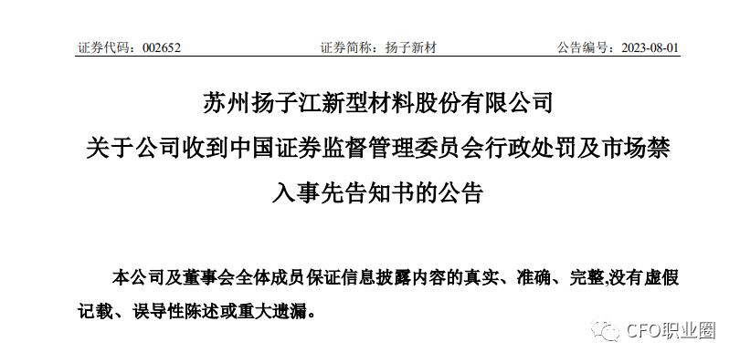 “苏州扬子江新型材料股份有限公司(以下简称扬子新材)涉嫌信息披露违法违规一案,已由我会调查完毕,我会依法拟对你们作出行政处罚及釆取市场禁入措施。现将我会拟对你们作出行政处罚及釆取市场禁入措施所根据的违法事实、理由、依据及你们享有的相关权利予以告知。