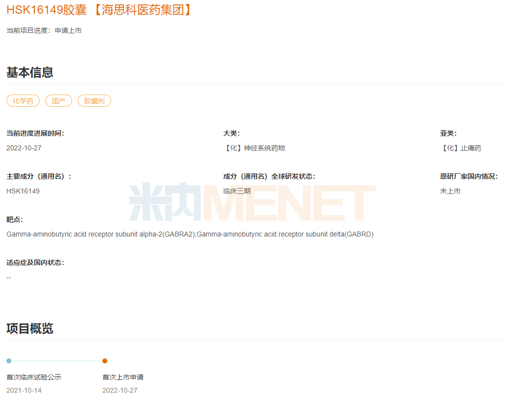 在此之前,海思科的创新药HSK16149胶囊上市申请获CDE受理,目前在审评审批中。据了解,HSK16149胶囊是海思科具有自主知识产权的1类新药,拟用于周围性神经病理性疼痛的治疗,而该产品的另一项中国带状疱疹后神经痛患者的Ⅲ期双盲研究也在正常推进中。