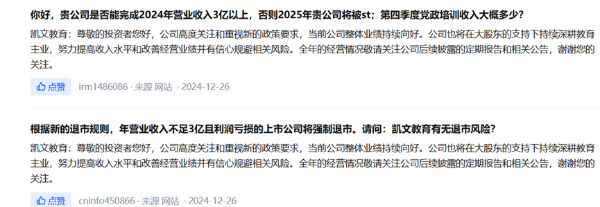 连续不断的亏损使得中小投资者忧心忡忡,有投资者在互动平台表达了对凯文教育是否有被ST或退市风险的担忧。凯文教育回应称,当前公司整体业绩持续向好。公司也将在大股东的支持下持续深耕教育主业,努力提高收入水平和改善经营业绩并有信心规避相关风险。