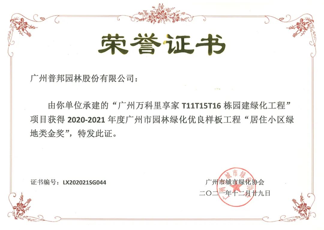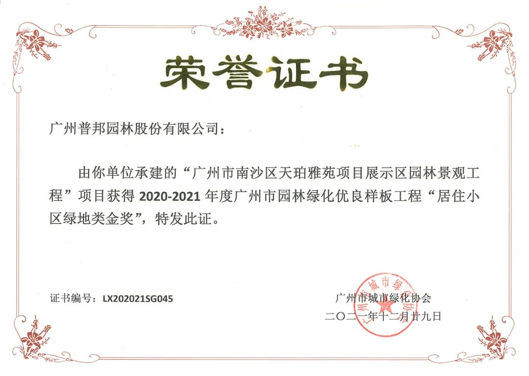 广州市“园林绿化优良样板工程(含绿化养护优良样板工程)”评选活动旨在不断加强我市园林绿化建设,促进我市园林绿化行业科技进步,提高我市园林绿化工程设计、施工和管理水平,巩固我市园林绿化已取得的成果。该奖项是广州市园林绿化工程的最高奖项,是广州市城市绿化协会对普邦股份精湛项目品质的高度认可。