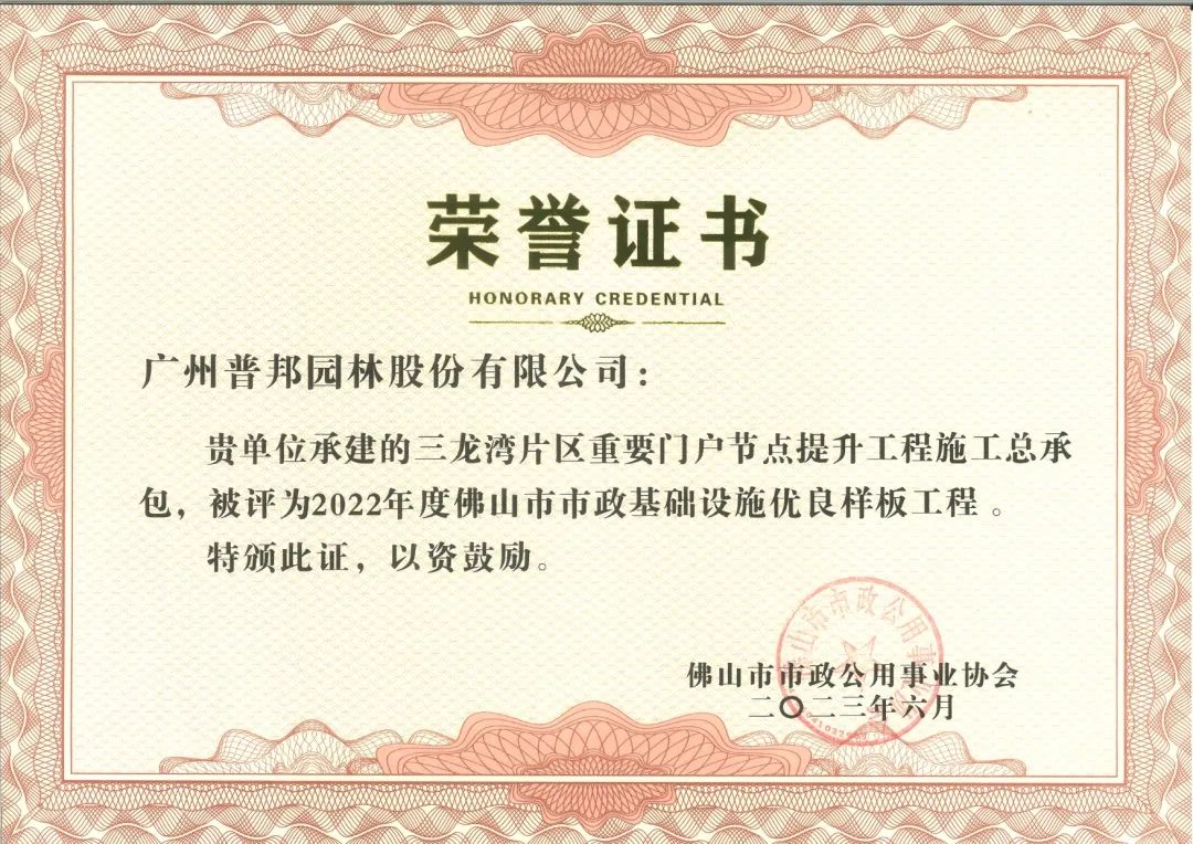 · 1项目获“2022年度佛山市市政基础设施优良样板工程奖(市政绿化)”