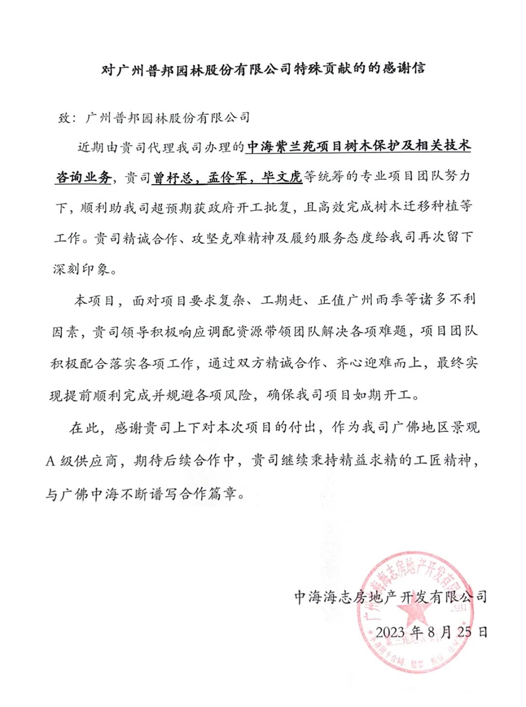 ·获中海地产旗下中海海志房地产开发有限公司特殊贡献感谢信,并晋升为“广佛地区景观A级供应商”