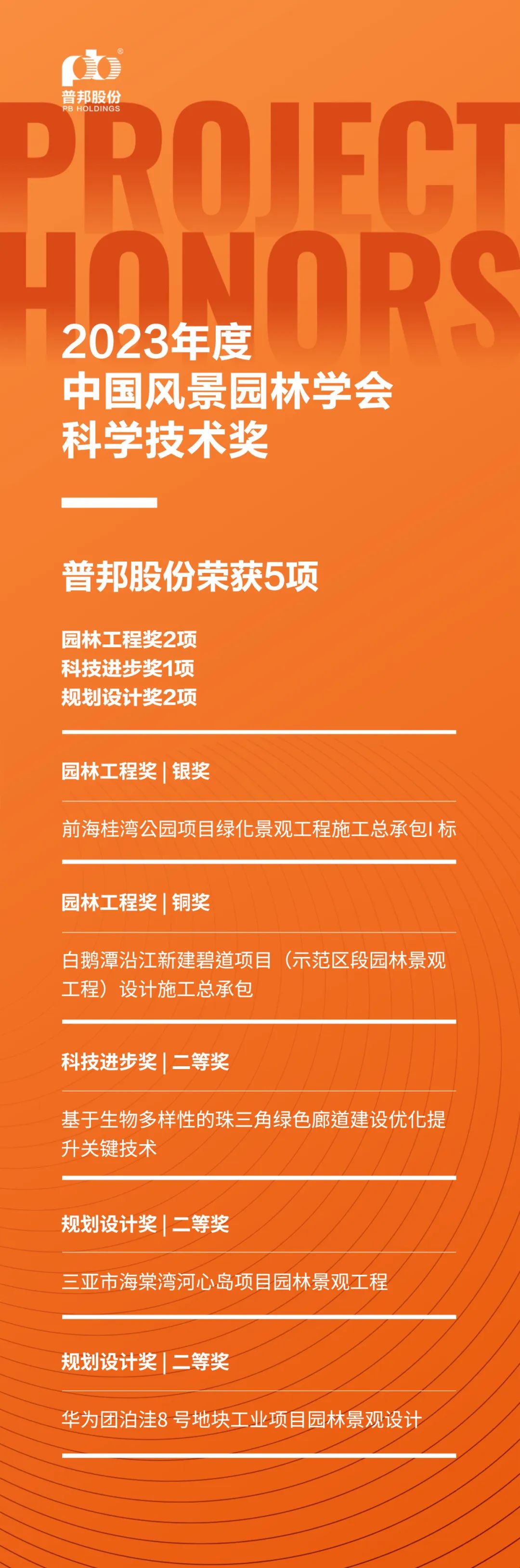 近日,中国风景园林学会发布《关于公布2023年度中国风景园林学会科学技术奖评审结果的通知》。本次评奖中,普邦股份收获颇丰,共计5个项目从1068个参评项目中脱颖而出,荣获奖项。