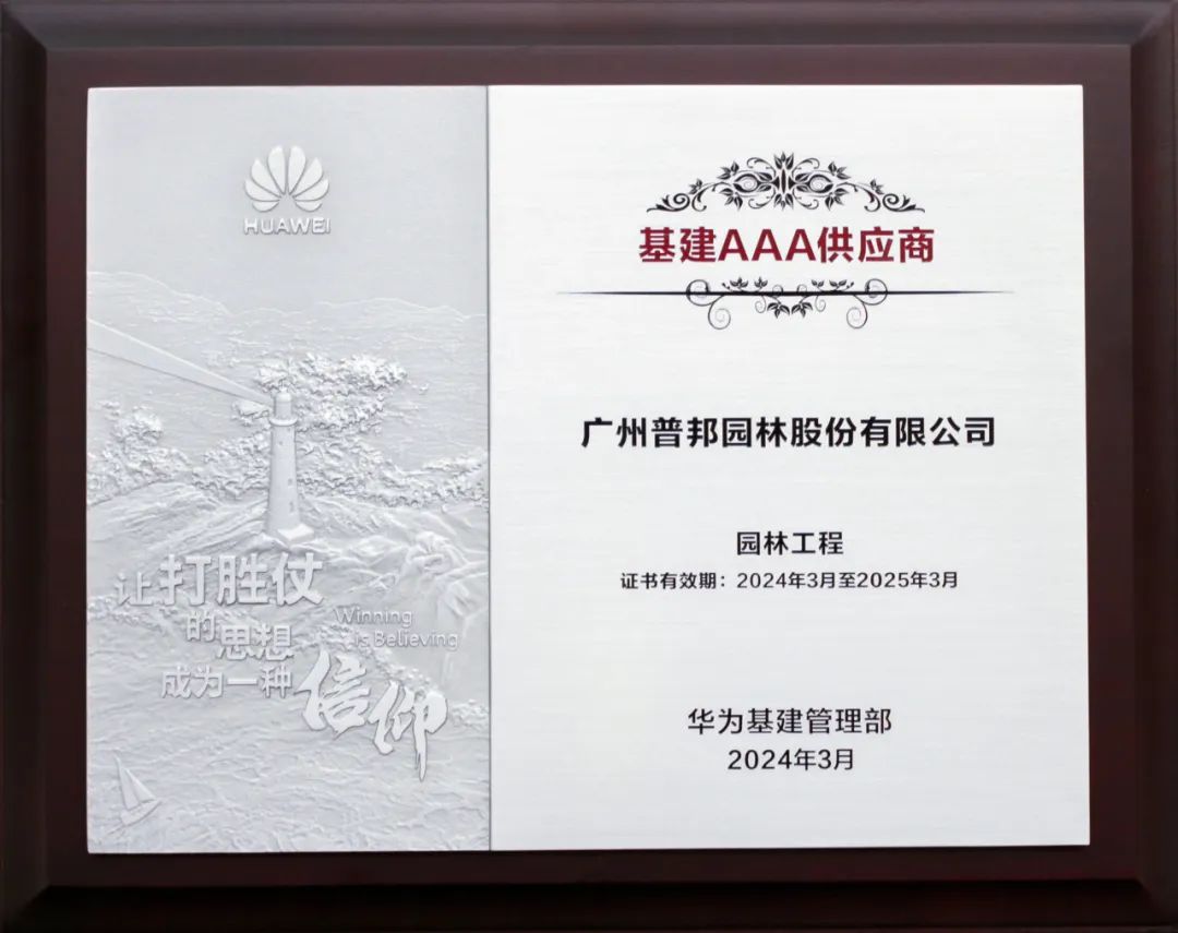 3月27日,华为基建AAA供应商颁奖大会在东莞松山湖召开。会上,普邦股份荣获华为基建AAA供应商(园林工程),成为唯一入选且连续两年入选的园林工程专业单位。