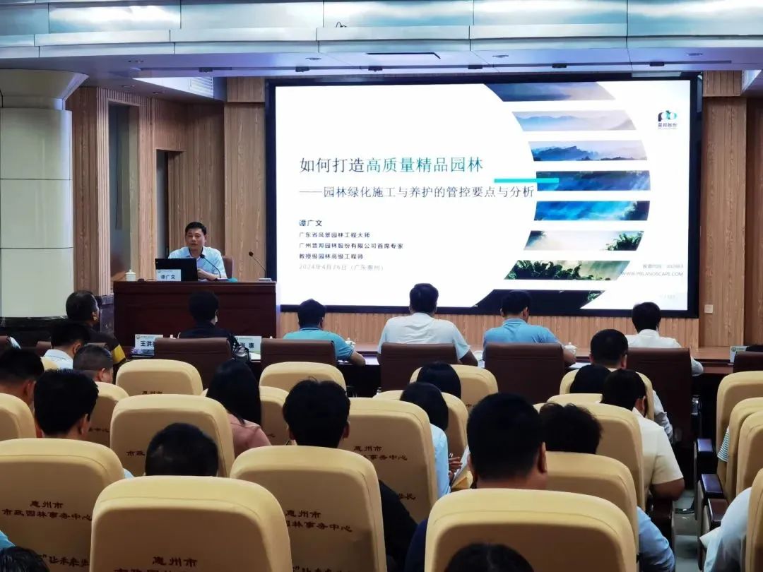 为更好地贯彻落实科学绿化精神,助力惠州市政园林事业的高质量发展,4月26日下午,惠州市市政园林事务中心特邀广东省风景园林工程大师、普邦股份首席专家、教授级高级工程师谭广文开展“打造高质量精品园林”主题授课。会议由惠州市市政园林事务中心副主任徐金勇主持,惠州市市政园林事务中心技术骨干、惠州市园林学会专家会员等100余人出席。