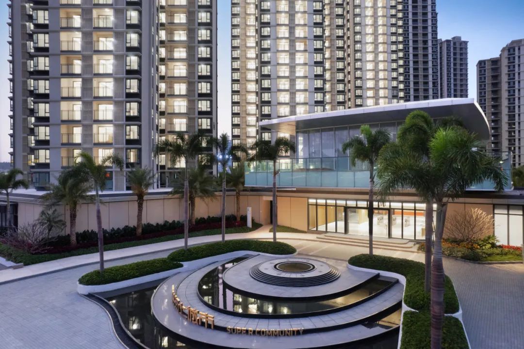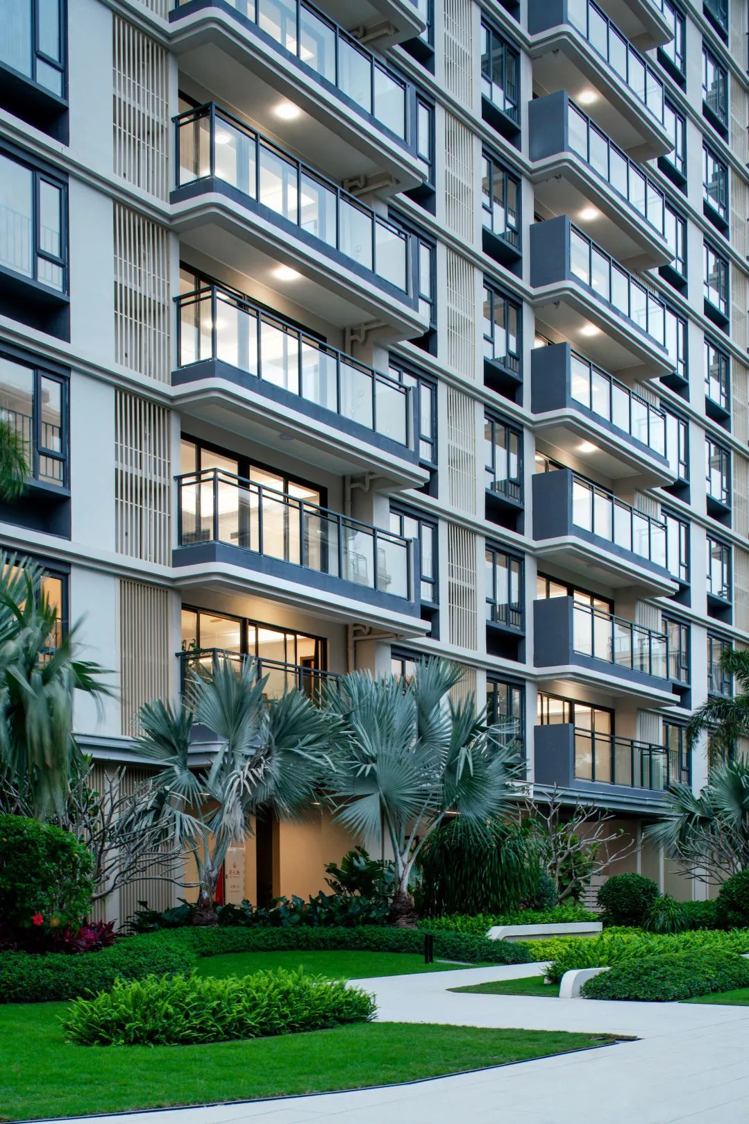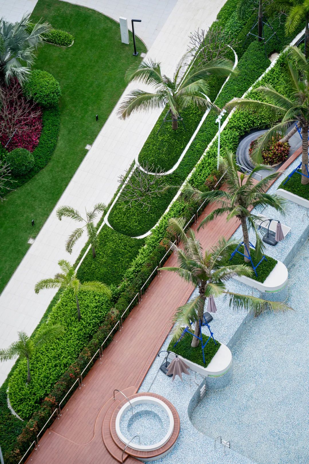 整体景观结合地形差异,以硬质铺装和乔木为主分隔空间,形成曲径通幽的意境;通过绿化手法穿插色块分割及草坪空间,缓解全铺装带来的枯燥感与空旷感;植入专属功能性空间,通过特色廊架和泳池、森林主题雕塑小品等,强化穿越椰林归家的氛围感。项目通过提取浪的流线形成整体感受,构筑出岛居的理想与品质的度假生活空间。