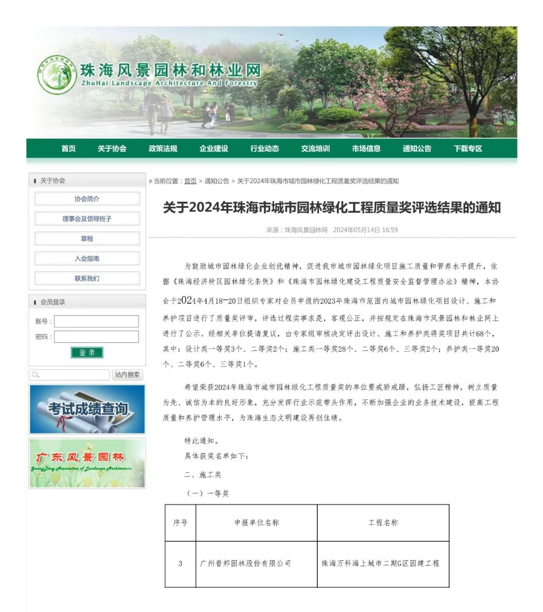 近日,由珠海市风景园林和林业协会主办的珠海市城市园林绿化工程质量奖评选活动落下帷幕,普邦股份送审参评的珠海万科海上城市二期G区园建工程荣获“2024年度珠海市城市园林绿化工程质量奖”一等奖!