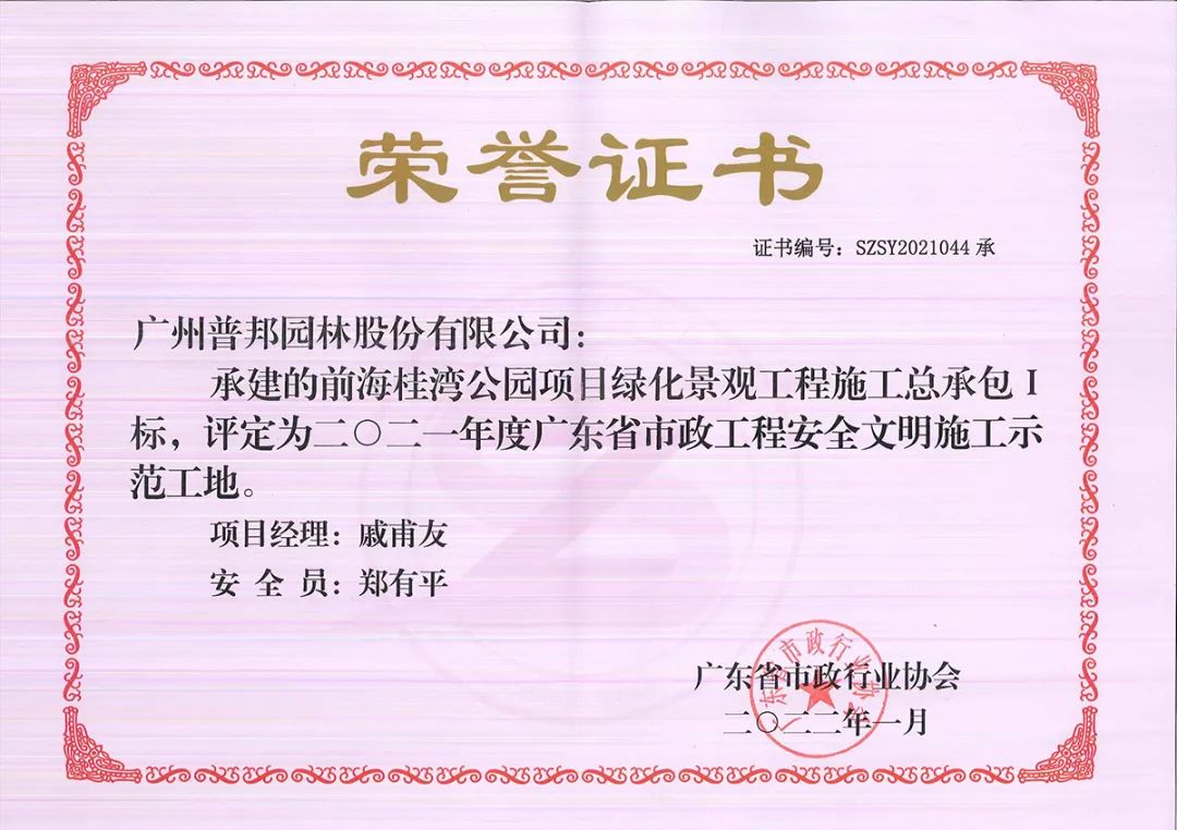 以普邦施工项目为例,前海桂湾公园屡获深圳市住建局安全生产示范基地,并荣获“广东省市政工程安全文明施工示范工地”及“深圳市建设工程安全生产与文明施工优良工地奖”。