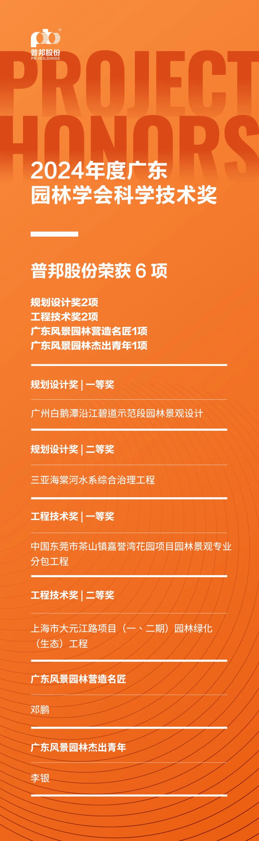 近日,广东园林学会公布了2024年度广东园林学会科学技术奖获奖名单。普邦股份斩获6项大奖,包括规划设计奖2项、工程技术奖2项、广东风景园林营造名匠1项,广东风景园林杰出青年1项。