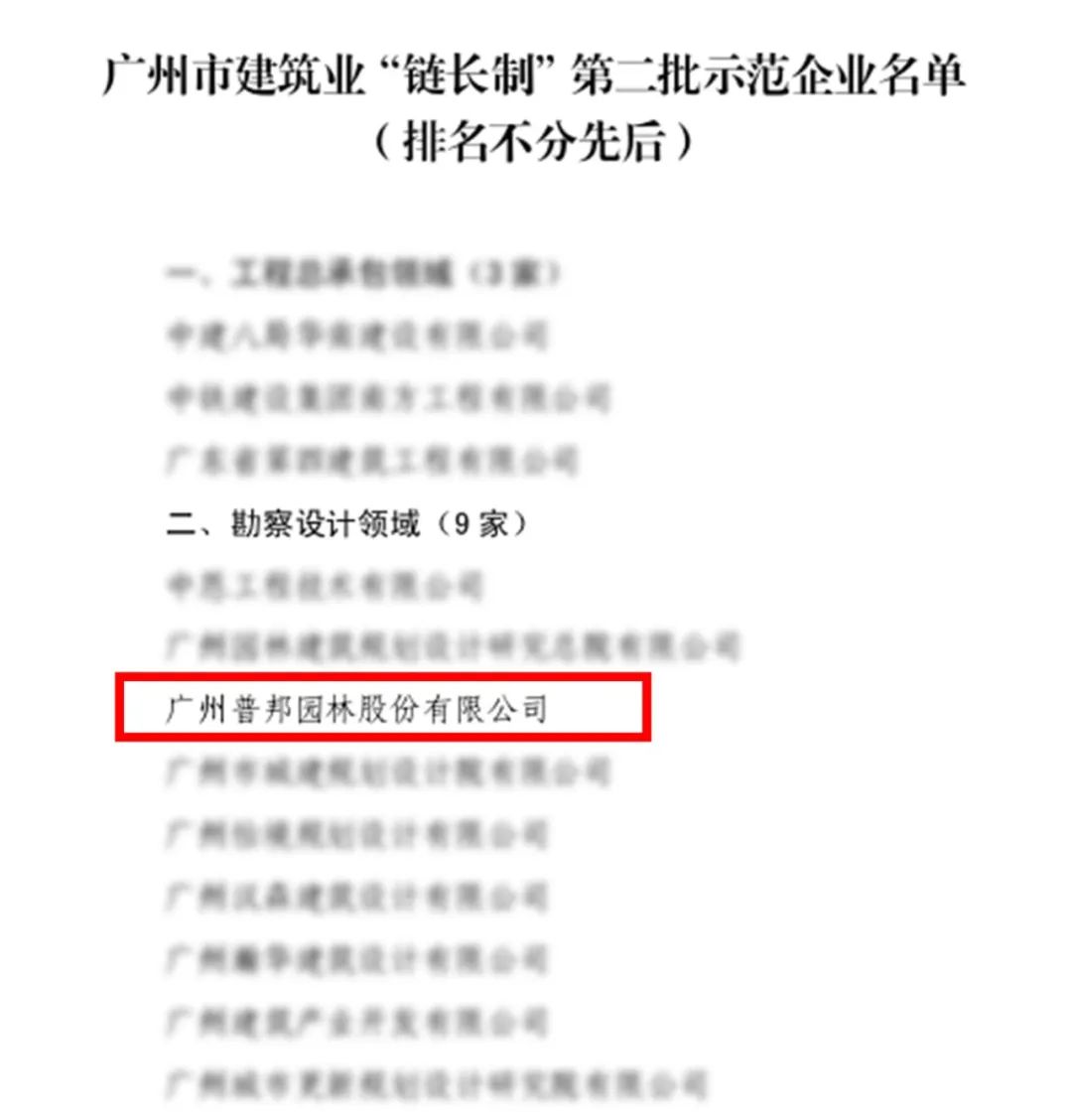 近日,广州市住房和城乡建设局发布了《关于公布建筑业“链长制”工作第二批示范企业名单的通知》,普邦股份凭借园林行业龙头企业的专业实力,成功入选广州市建筑业“链长制”勘察设计领域示范企业名单。