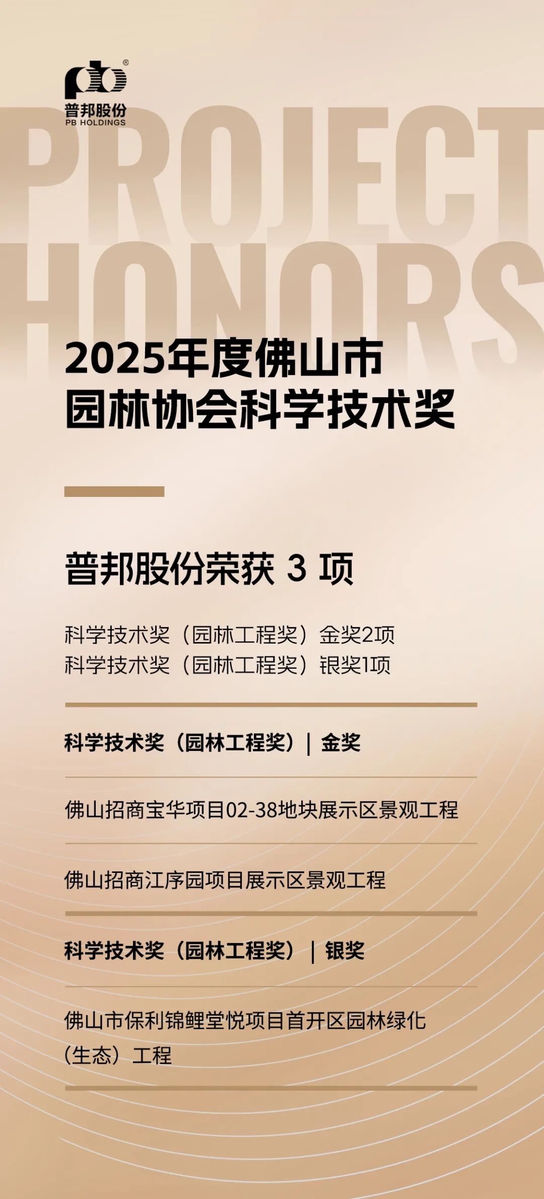 近日,由佛山市园林协会主办的2025年度佛山市园林协会科学技术奖评选活动落下帷幕,普邦股份送审参评的3个项目荣获2金1银。