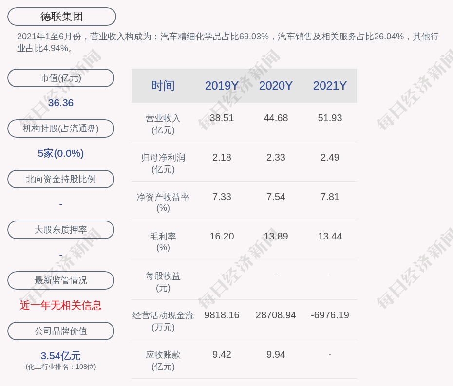 2021年1至6月份,德联集团的营业收入构成为:汽车精细化学品占比69.03%,汽车销售及相关服务占比26.04%,其他行业占比4.94%。