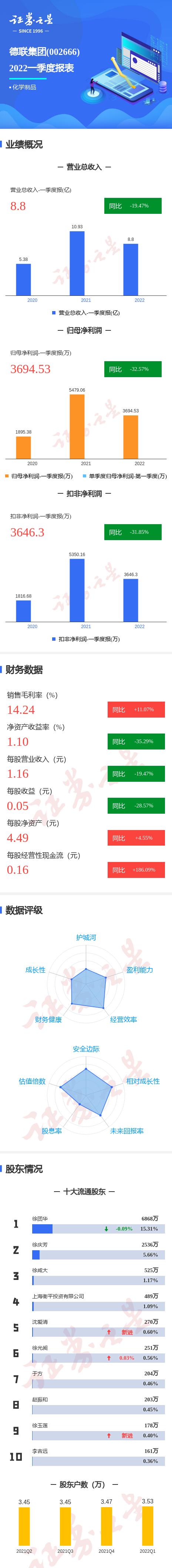 德联集团2022一季报显示,公司主营收入8.81亿元,同比下降19.47%;归母净利润3694.53万元,同比下降32.57%;扣非净利润3646.31万元,同比下降31.85%;其中2022年第一季度,公司单季度主营收入8.81亿元,同比下降19.47%;单季度归母净利润3694.53万元,同比下降32.57%;单季度扣非净利润3646.31万元,同比下降31.85%;负债率23.63%,投资收益-674.96万元,财务费用411.43万元,毛利率14.24%。
