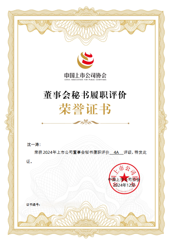 12月17日,中国上市公司协会发布“2024上市公司董事会秘书履职评价”结果,康达新材副总经理、董事会秘书沈一涛再度荣获董事会秘书履职评价4A级评级。