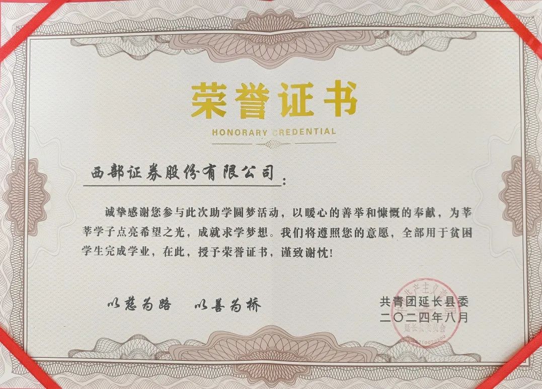 仪式上,中共延长县委常委、副县长郝文强介绍了“助学圆梦青春起航”优秀贫困大学生资助三年行动方案,延长县团委书记房翻就爱心捐赠资金管理办法及2024年贫困大学生资助有关情况作了简要说明,延长县县委书记曹林虎代表延长县向捐赠企业及爱心人士的大爱之举表达了谢意,并勉励受资助学生要心怀感恩,回馈家乡和社会。谢群秘书长作为捐赠代表向延长县捐赠了资金,延长县代表随后向协会回赠了锦旗和捐赠荣誉证书,黄斌总代表公司接收了捐赠荣誉证书。“种下一棵树,收下一片绿荫;献出一份爱心,托起一份盼望。”爱心助学是一项功在当代、利在千秋的伟大事业,为构建和谐社会、推动乡村振兴具有积极而深远的意义。西部证券作为我省金融产业的骨干企业,始终积极履行国有控股金融企业的使命担当,坚持以习近平新时代中国特色社会主义思想为指引,认真贯彻关于脱贫攻坚和乡村振兴系列重要讲话精神,本次捐赠资金6万元参与“助学圆梦青春起航”捐资助学活动,也是希望能够助力延长县的贫困学子通过教育改变家庭命运、阻断贫困代际传递、创造幸福生活、开启美好未来,更好地回馈社会,促进延长县高质量发展。