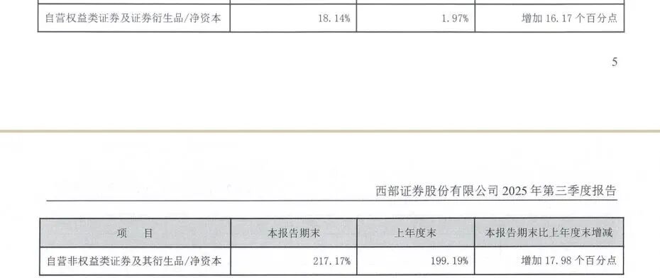 2024年9月末,西部证券的自营权益类证券及证券衍生品/净资本为8.03%,2024年12月末下降至1.97%,然后持续增加,2025年3月末为6.88%,2025年6月末为10.89%,2025年9月末为18.14%。
