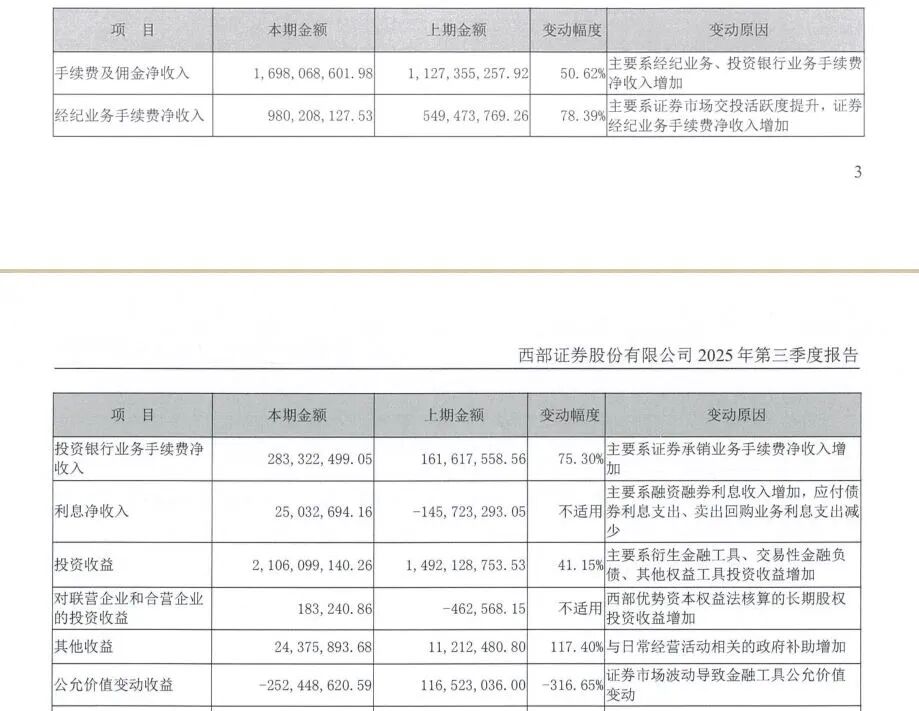 一块是经纪业务。2025年前三季度,西部证券的经纪业务手续费净收入为9.80亿元,较去年同期增加了4.31亿元,同比增长78.39%。