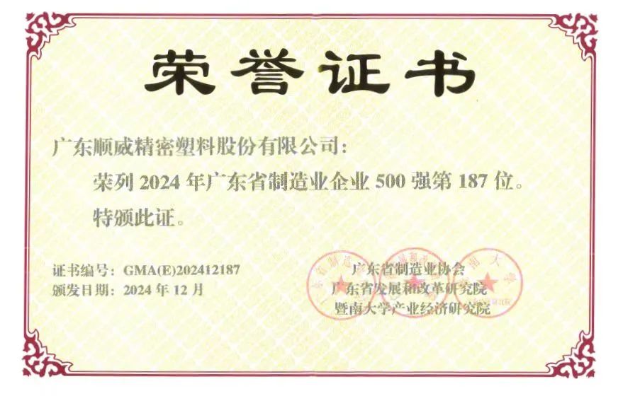 12月3日,2024年广东省制造业500强企业峰会在广州举行。会上揭晓了2024年广东省制造业500强榜单,集团控股的上市公司广东顺威精密塑料股份有限公司(以下简称“顺威股份”)凭借强大的研发能力、先进的生产制造实力和卓越的产品品质,成功跻身“广东省制造业500强”榜单,位列187名,较2023年排名上升了10名。
