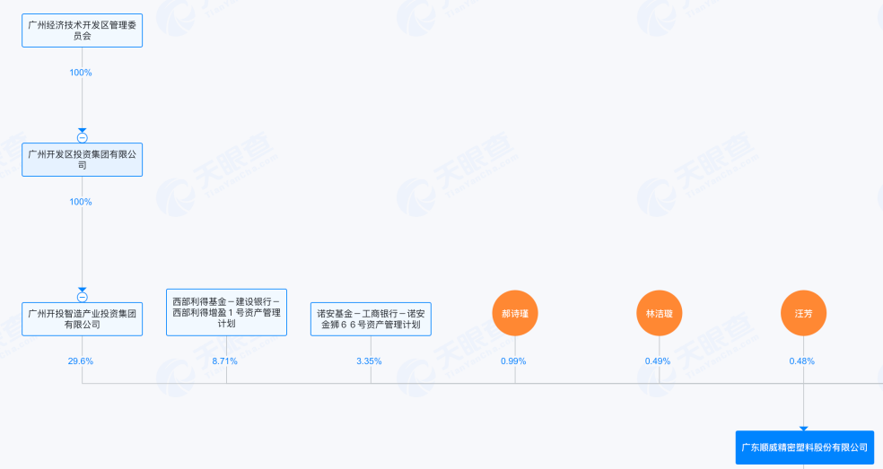 广东顺威精密塑料股份有限公司成立于1992年,法定代表人为李永祥,注册资本7.2亿元,大股东为“广州开投智造产业投资集团有限公司”,持股比例为29.6%,该公司是“广州经济技术开发区管理委员会”旗下全资子公司,顺威股份实际控制人为广州开发区国资委。