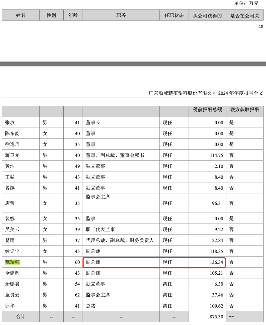 正因为分管业务在公司举足轻重,根据顺威股份2024年年报,范瑞强领走136.34万元的薪酬,拿下顺威股份高管薪酬之首。