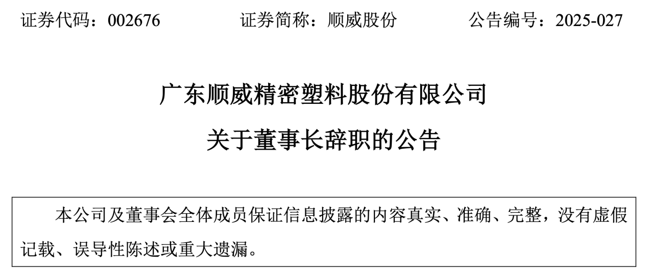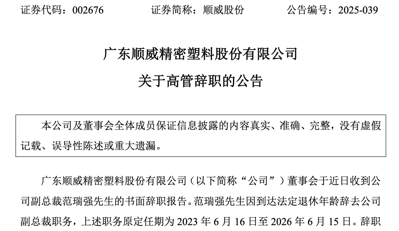 近日,佛山制造业上市公司顺威股份(002676.SZ)发布一则高管变动公告引发关注:公司副总裁范瑞强因达到法定退休年龄,正式辞去副总裁职务,辞职自报告送达董事会之日起生效。
