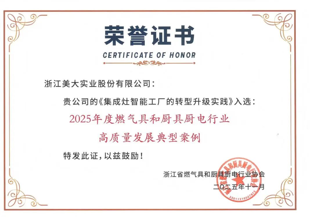 此次,浙江美大荣获两大“高质量发展典型案例”,不仅体现了行业对美大技术研发实力与智能制造水平的高度认可,更标志着美大在推动厨电产业向“高质量、智能化、绿色化”转型升级过程中迈出了坚实一步,具有重要的示范意义。