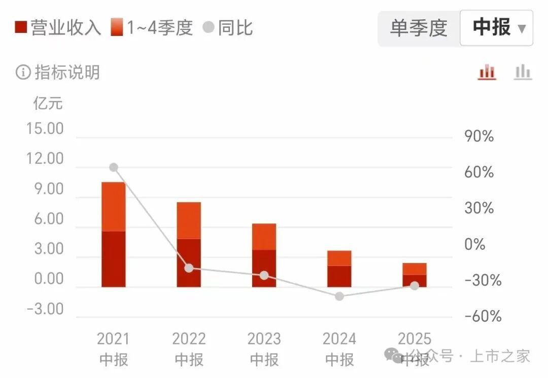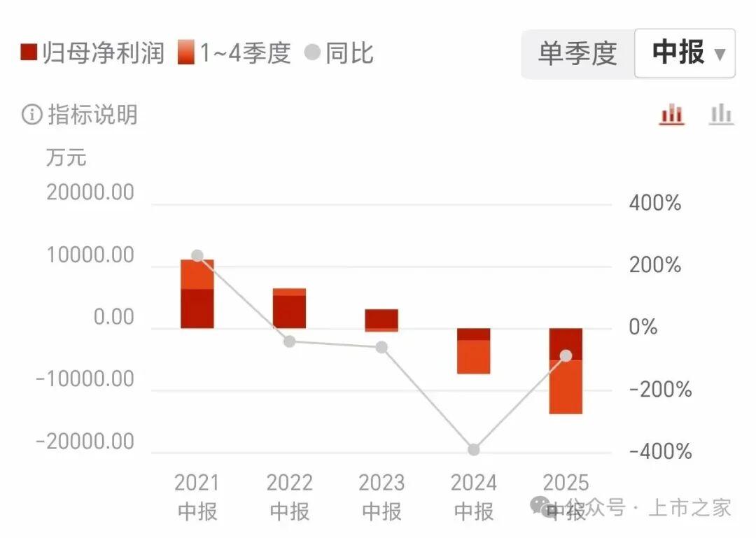 从近年同期数据对比来看,公司营收已连续多年下滑。2023年上半年营收同比降幅为25.19%,2024年上半年扩大至42.65%,2025年上半年虽较去年同期降幅略有收窄,但仍维持在30%以上的高位。净利润方面,亏损幅度呈扩大趋势,2024年上半年归母净利润亏损7326.69万元,2025年上半年亏损额同比近乎翻倍。