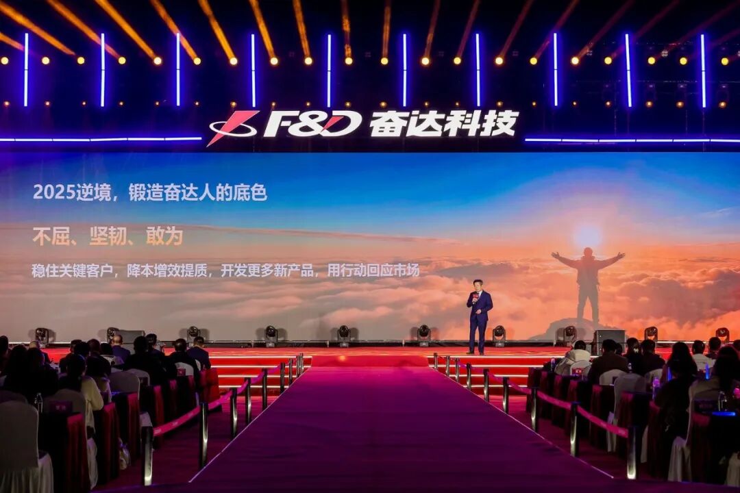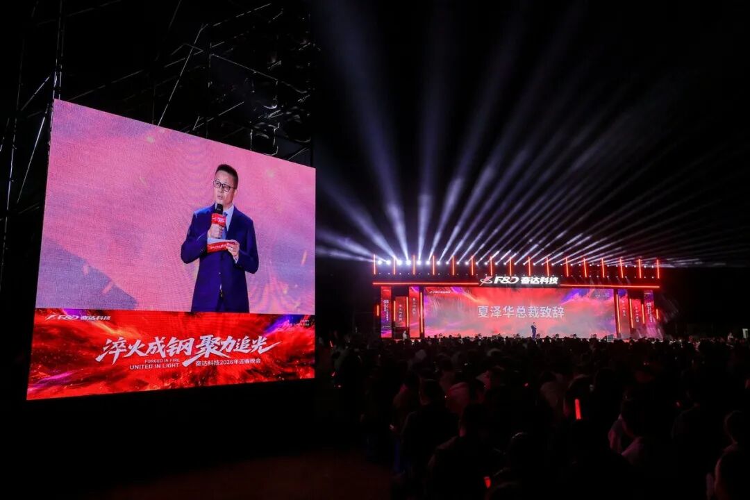 奋达科技总裁夏泽华先生首先登台致开幕辞。他肯定了全体奋达人在过去一年中展现出的坚韧与智慧,强调了在复杂环境中淬炼内核、坚定前行的重要性,并为新一年的征程吹响了奋进的号角。