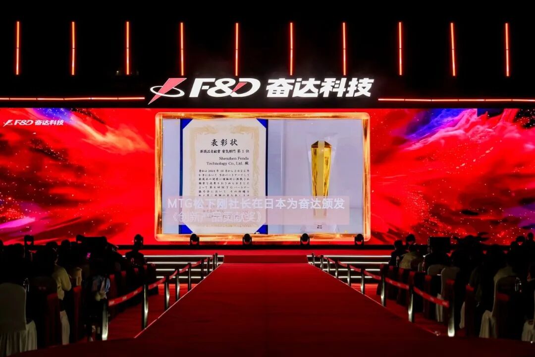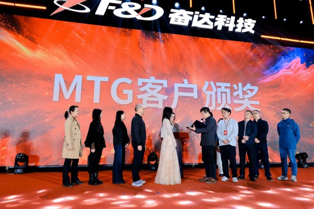 一份来自重要合作伙伴MTG的惊喜,为荣耀时刻增添了别样光彩。MTG客户代表亲临现场,向奋达科技颁奖,并对双方的精诚合作与共创成果给予了高度评价。肖奋董事长代表公司回赠礼品,寓意情谊长存,共赴未来。