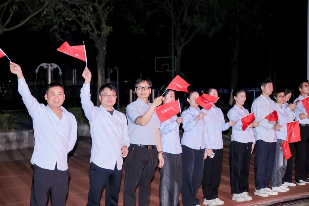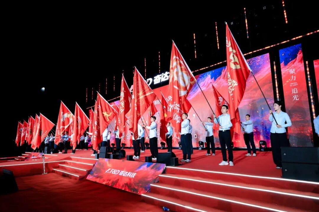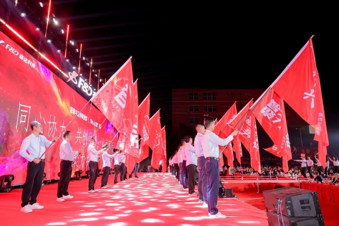 在精彩纷呈的节目表演后,晚会迎来了气势恢宏的《奋达必胜》战旗荣耀T台秀。各事业部、体系代表高举战旗,以昂扬姿态展示团队风采与必胜决心。更令人振奋的是,现场通过视频连线,与远在越南的奋达战友实时互动,让“奋达必胜”的呐喊跨越山海,响彻同一片天空,彰显了公司全球化团队的团结与力量。