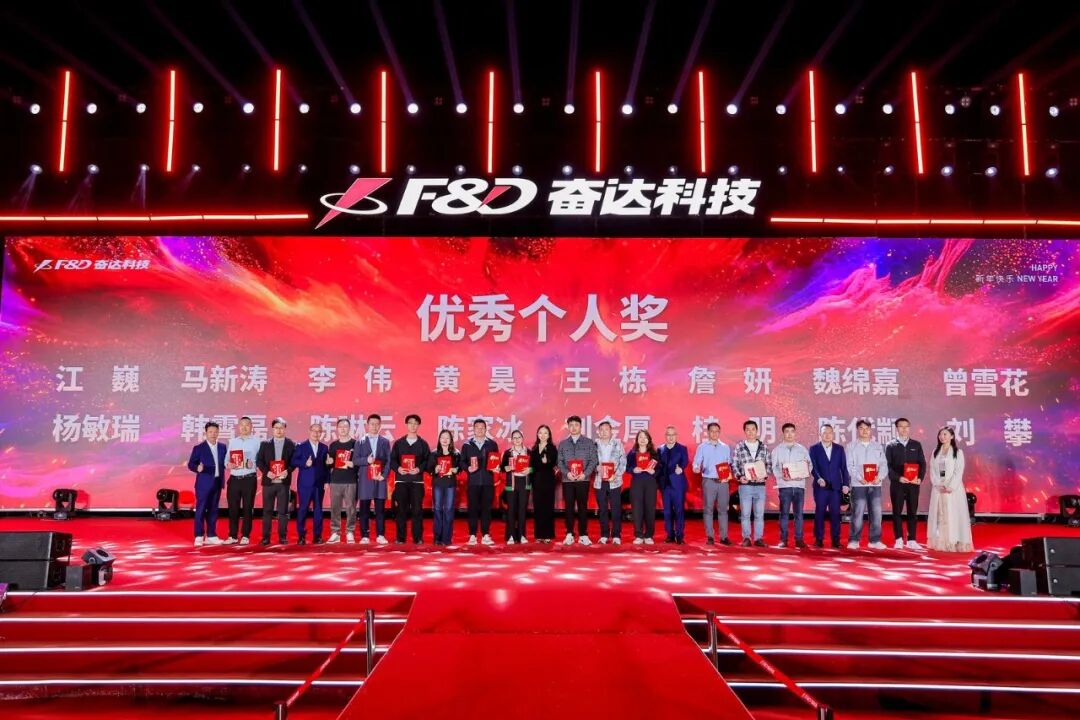 备受瞩目的年度优秀表彰环节相继揭晓:“扭亏为盈团队奖”授予了实现逆境翻盘的乐程式团队;“优秀团队奖”花落电器技术部结构二组、越南二厂扩建项目团队、智慧能源产品项目团队、智能家居H锁团队四个标杆集体;16位来自各条战线的杰出代表荣膺“优秀个人奖”。奋达科技管理层分别为获奖团队与个人颁奖,现场掌声雷动,向奋斗者致敬。