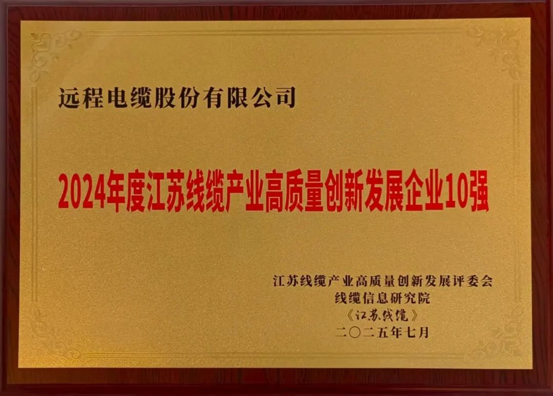 7月25日,江苏省线缆行业高质量发展峰会在南通隆重召开,会上重磅发布了“江苏线缆产业高质量创新发展企业10强”榜单,远程电缆股份有限公司凭借卓越的综合实力成功入选,荣膺“2024年度江苏线缆产业高质量发展企业10强”称号。