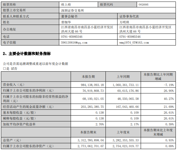 财报显示,2025年上半年,煌上煌实现营业收入9.84亿元,同比减少7622.36万元,降幅为7.19%。然而,其归母净利润却达到7691.99万元,同比大幅增长26.90%,扭转了去年同期的下滑态势。