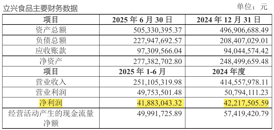 若从财务数据层面来看,立兴食品的确能给煌上煌带来不小的助力。公告显示,立兴食品2025年上半年净利润0.42亿元,几乎追平2024年全年的利润水平。若此次交易成功,将在并表后一定程度拉升煌上煌的业绩。