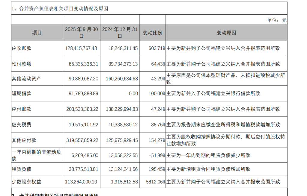 立兴食品的“赚钱能力”确实诱人:2025 年上半年净利率 16.68%,是煌上煌同期的两倍多,还手握瑞幸、三只松鼠等大客户,产品覆盖婴童食品、预制菜等多个赛道。但这笔交易的代价同样沉重——截至今年9月底,煌上煌应收账款1.28亿元,较年初增长6倍;商誉从2242.30万元飙升至3.35亿元;其他应付款从1.26亿元增至3.20亿元,同比增长154.27%。