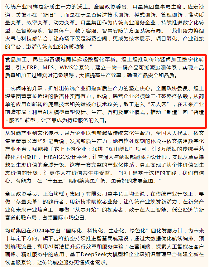 春潮涌动,奋楫者先。载誉而归的褚浚委员深感责任在肩、使命如磐。他表示,将第一时间把会议精神转化为推动企业转型升级和创新发展的强大动力,在新的起点上,带领煌上煌继续以科技创新为翼,以产业富民为根,在高质量发展的征途中笃行不怠,为“十五五”规划的宏伟蓝图贡献民营企业的智慧与力量。