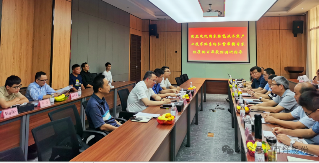 在调研座谈会上,孙立海总经理为体系专家组介绍了国信集团和百洋股份基本情况和发展规划,对近期国内外发展业务进行了交流,并详细讲解了新阶段百洋发展的企业文化理念及研发团队情况。杨弘研究员介绍了国家特色淡水鱼产业技术体系近期发展情况,回顾了百洋作为体系站长成员单位以往的合作历程,并表示此次调研旨在为后续合作奠定基础。基于以往良好的合作基础,广西水产科学院罗永巨院长、集美大学翟少伟教授、江苏大学高瑞昌教授等多位专家在座谈会上积极回应并提出了合作方向建议。
