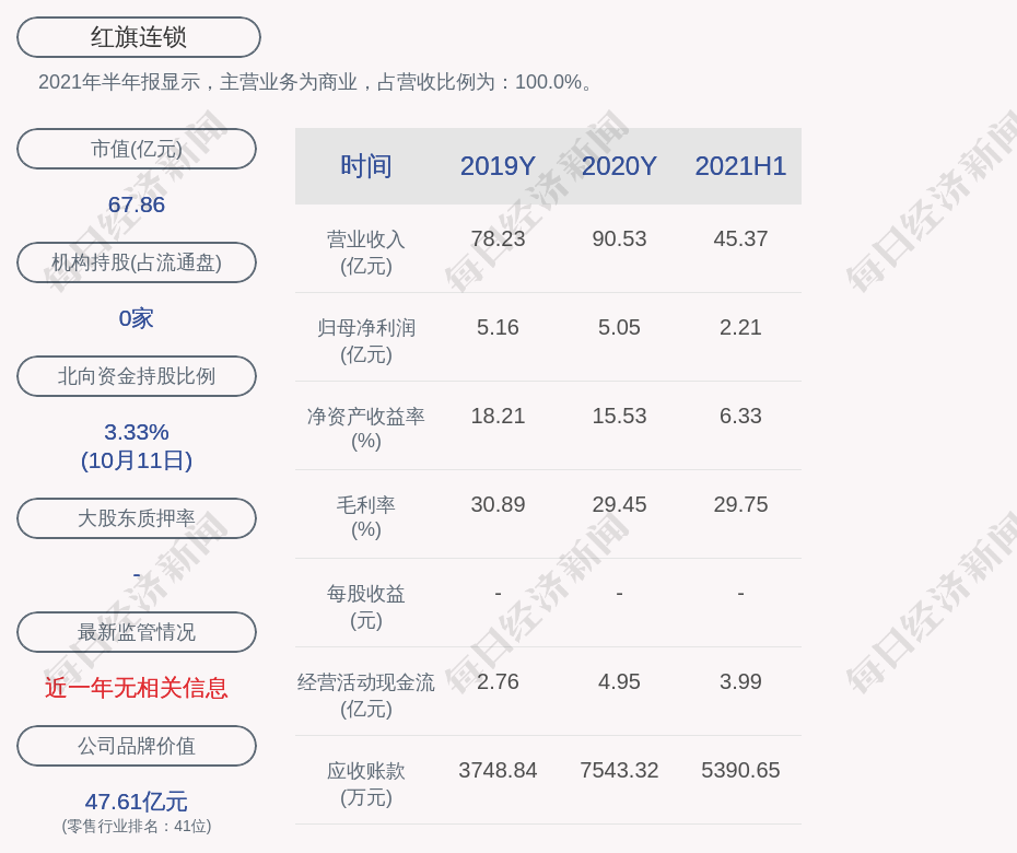 2021年半年报显示,红旗连锁的主营业务为商业,占营收比例为:100.0%。