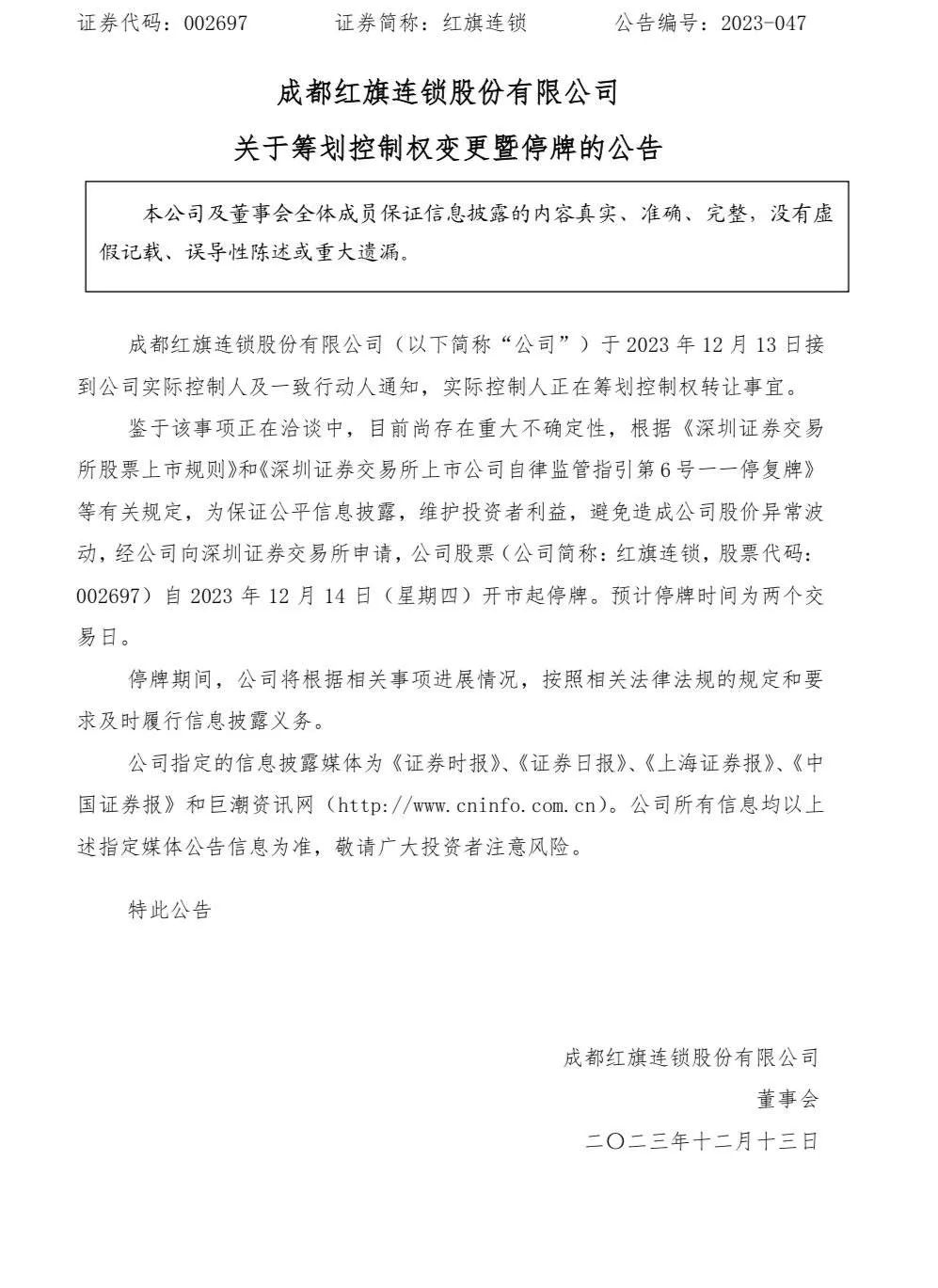 12月13日晚间,红旗连锁发布公告称,成都红旗连锁股份有限公司于2023年12月13日接到公司实际控制人及一致行动人通知,实际控制人正在筹划控制权转让事宜。鉴于该事项正在洽谈中,目前尚存在重大不确定性,为保证公平信息披露,维护投资者利益,避免造成公司股价异常波动,经公司向深圳证券交易所申请,公司股票自2023年12月14日开市起停牌。预计停牌时间为两个交易日。
