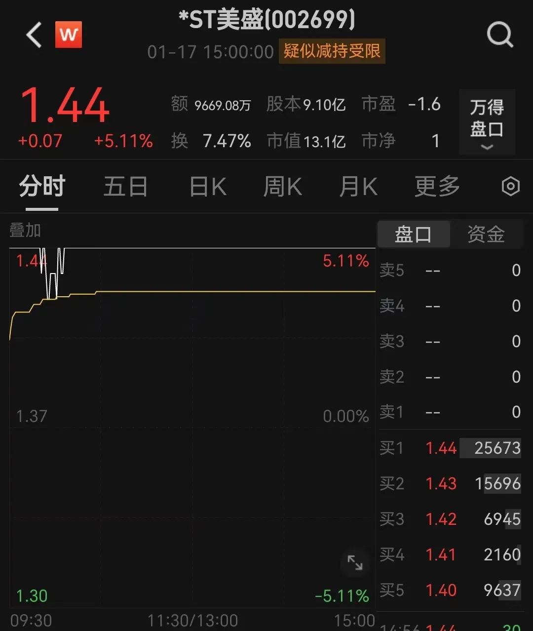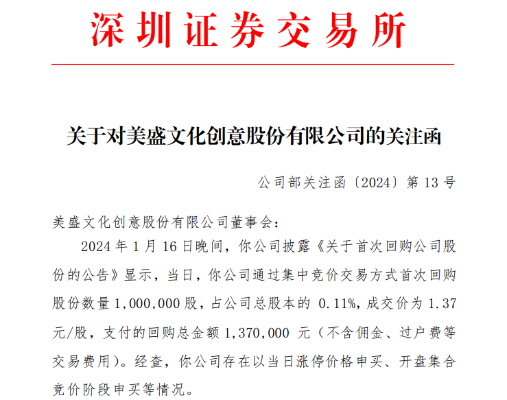 2024年1月16日晚间,*ST美盛公告,当日通过集中竞价交易方式首次回购股份100万股,占公司总股本的0.11%,成交价为1.37元/股,支付的回购总金额137万元。当天*ST美盛股价涨停。更多内容请看《A股罕见?!直接涨停价回购,惊动交易所!》