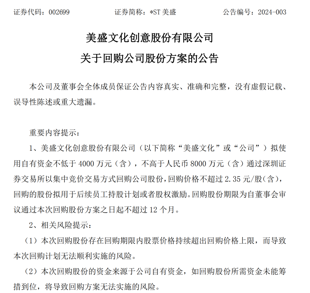 2024年1月12日晚间,*ST美盛公告,其拟使用自有资金不低于4000万元(含),不高于8000万元(含)回购公司股份,回购价格不超过2.35元/股。