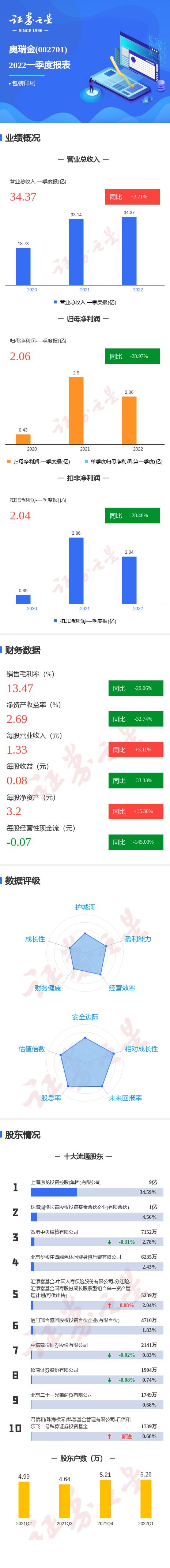 奥瑞金2022一季报显示,公司主营收入34.37亿元,同比上升3.71%;归母净利润2.06亿元,同比下降28.97%;扣非净利润2.05亿元,同比下降28.48%;其中2022年第一季度,公司单季度主营收入34.37亿元,同比上升3.71%;单季度归母净利润2.06亿元,同比下降28.97%;单季度扣非净利润2.05亿元,同比下降28.48%;负债率52.45%,投资收益4857.29万元,财务费用7665.63万元,毛利率13.47%。