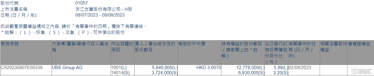 格隆汇8月8日丨根据联交所最新权益披露资料显示,2023年8月2日,浙江世宝(01057.HK)获UBS Group AG在场内以每股均价3.007港元增持好仓594万股,涉资约1786.2万港元。