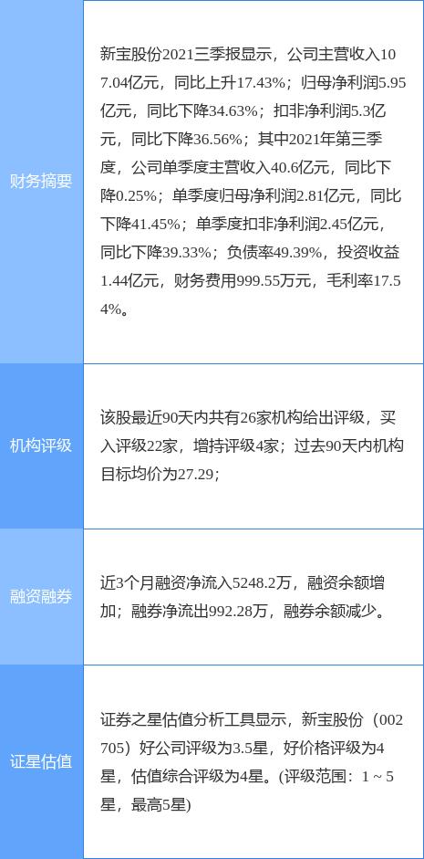 2021年11月3日,东方证券研究员李雪君,吴瑾发布了对新宝股份的研报《外销短期承压、内销降幅收窄,毛利率有望稳步改善》,该研报对新宝股份给出“买入”评级,认为其目标价为26.02元,研报发布时股价为24.43元,预期涨幅为6.51%。。证券之星数据中心根据近三年发布的研报数据计算,该研报作者对此股的盈利预测准确度为71.99%。