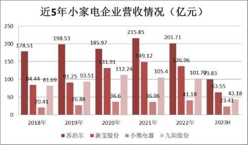 小家电市场中,头部企业有苏泊尔、新宝股份、九阳股份以及小熊电器等。在2019年前后,小家电市场进入火热期,2020年期间,电压力锅、空气炸锅等小家电品类都有着超200%的销量增长。数据显示,2019年和2020年,中国小家电市场零售额分别达到638亿、566亿,此后则又转冷,各个公司营收也随之下滑。