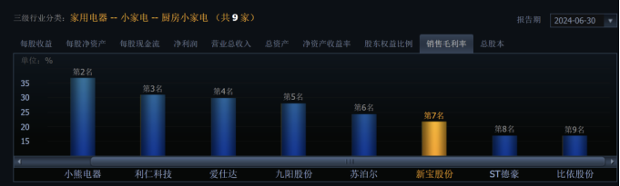 对比同行来看,公司的毛利率水平在同行中处于靠后位置。数据显示,今年上半年,在厨房小家电行业的9家上市公司中,新宝股份以21.76%的销售毛利率位列第七,排名相对靠后。