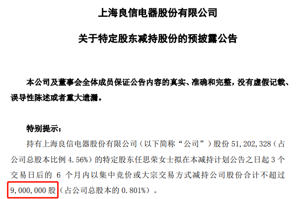 12月12日,良信股份发布减持股份的预披露公告,公司股东任思荣拟以集中竞价或大宗交易方式减持公司股份合计不超过900万股,占公司总股本的0.801%。