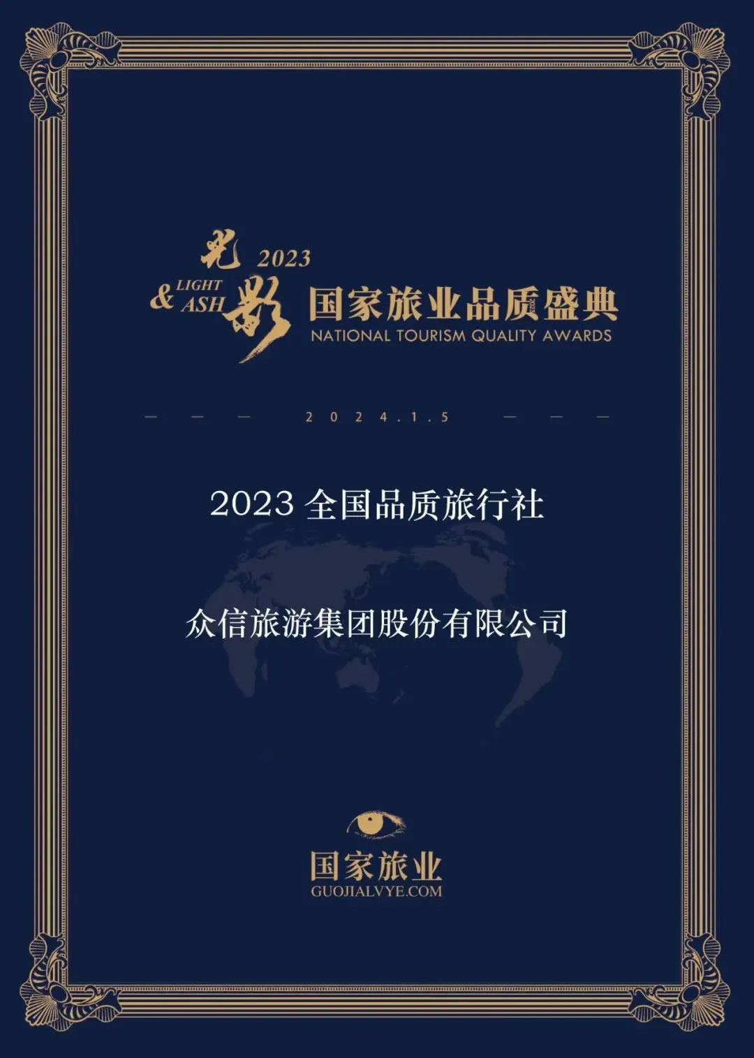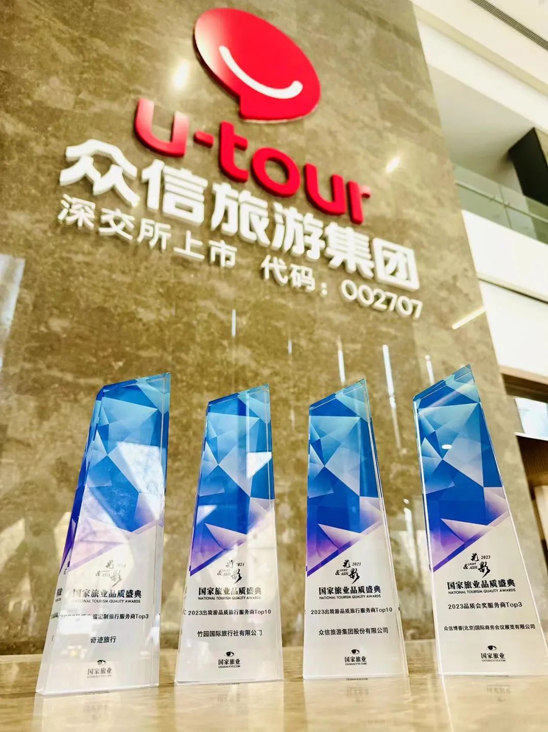 第十九届“光·影”国家旅业时尚盛典在京圆满落幕。众信旅游集团一举斩获多个重要奖项,众信旅游及全景旅游被评为“2023出境游品质旅行服务商TOP10”奖项,在出境品质服务综合评选领域内,众信旅游独占鳌头,一举荣获行业十强中的两个席位。此外,众信旅游被评为“全国品质旅行社”奖。众信旅游旗下高端品牌奇迹旅行荣获“2023品质高端定制旅行服务商TOP3”奖、众信旅游集团旗下众信博睿荣获“2023品质会奖服务商TOP3”奖。