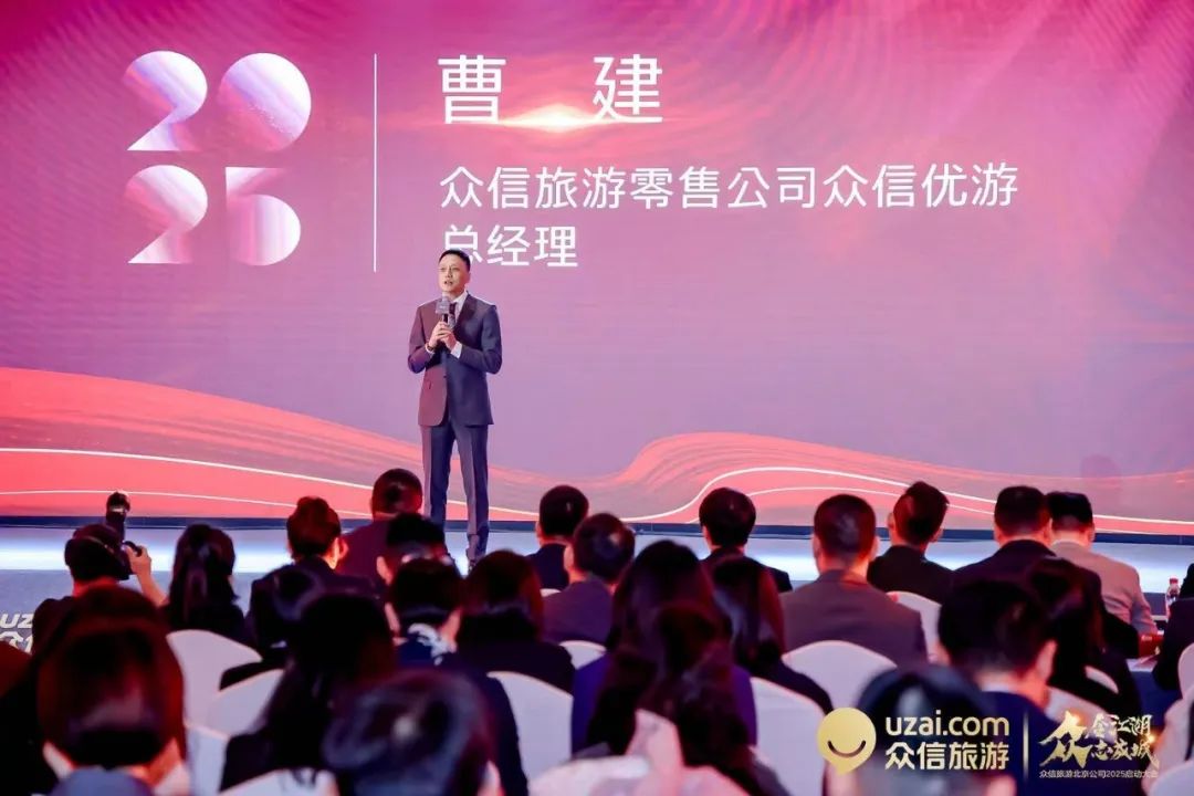 众信旅游零售公司众信优游总经理曹建率先发表重要讲话,他表示,众信旅游零售公司在2024年创下了GMV超26亿的喜人成绩,在全国范围内开设门店超过2200家,全年服务游客近50万人次。跟随众信旅游的脚步,我们的客人走遍了全国所有省市自治区,超过1800个城市,并用足迹点亮了超过全球90个国家及地区。这些亮眼成绩的背后,离不开众信优游在全国分公司同事们的辛苦付出。在产品端,众信旅游零售公司成功推出“众信制造”、“我的世界拼图”等叫好又叫座的产品系列。通过一系列线下展会及全国范围内门店升级的推进,进一步提升了门店的服务及运营能力。